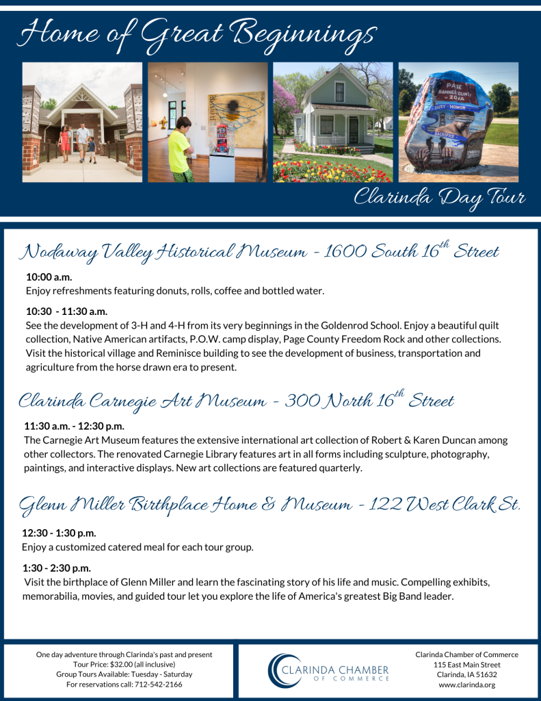 This leisurely 20 block tour features 14 historic buildings around the Clarinda boulevard.You may pick up a map at the Chamber office at 115 East Main Street.